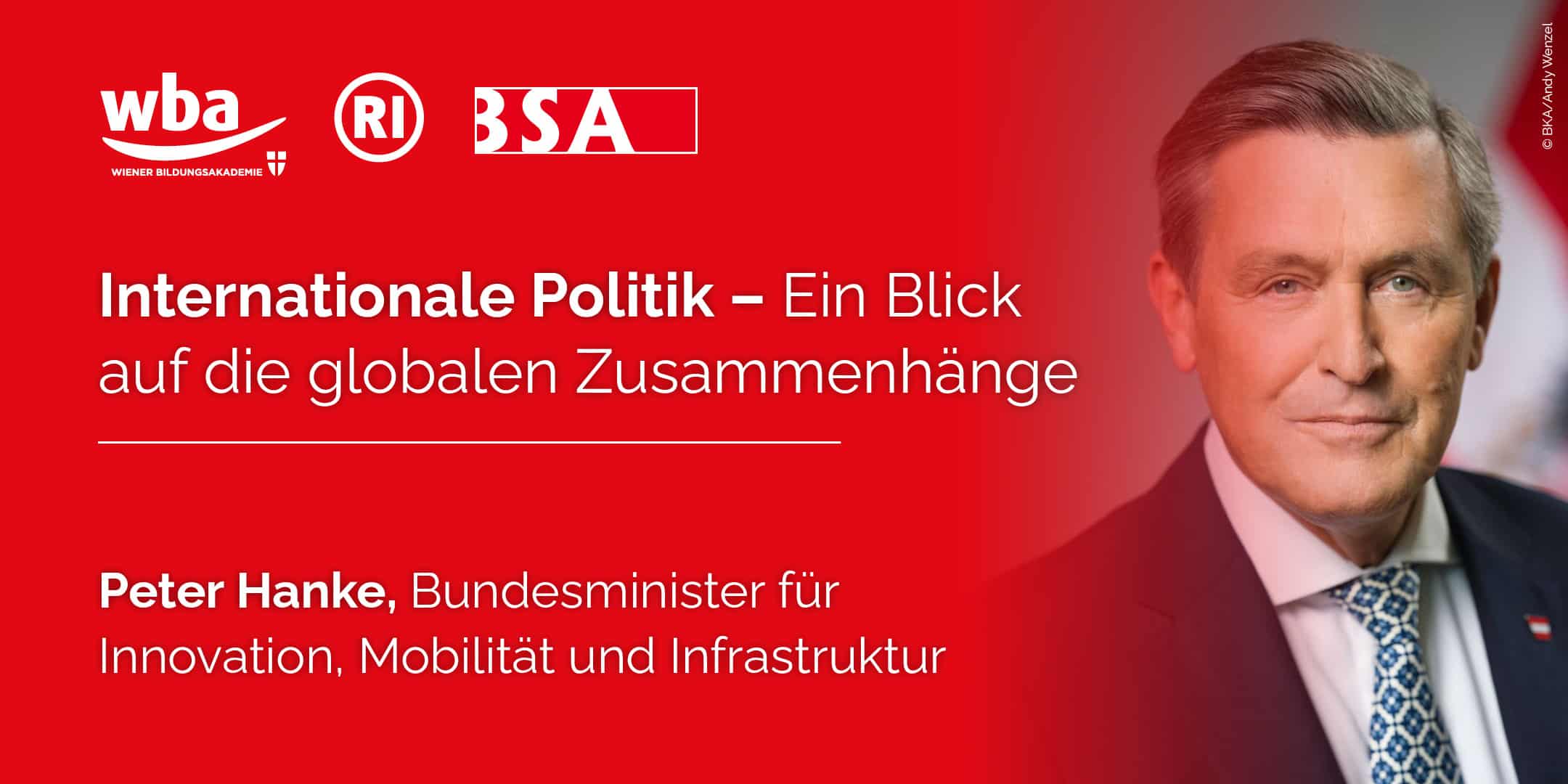 Wie wirkt Infrastrukturpolitik im Zusammenspiel mit internationalen Herausforderungen? Peter Hanke, ehemaliger Wiener Stadtrat für Finanzen und Internationales und heutiger Bundesminister für Innovation, Mobilität und Infrastruktur, spricht an diesem Abend über die globale Dimension von Verkehr, Energie, Digitalisierung und öffentlichem Raum.